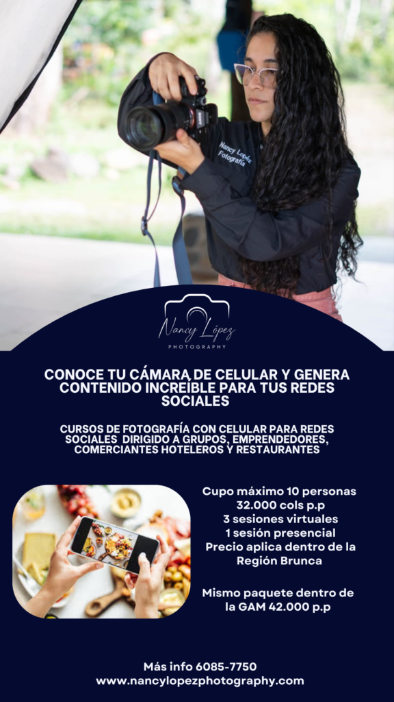 Además de ofrecer servicios de fotografía comercial, imparto cursos y capacitaciones especializadas dirigidas a grupos interesados en dominar el uso de la cámara del celular de forma práctica y efectiva.